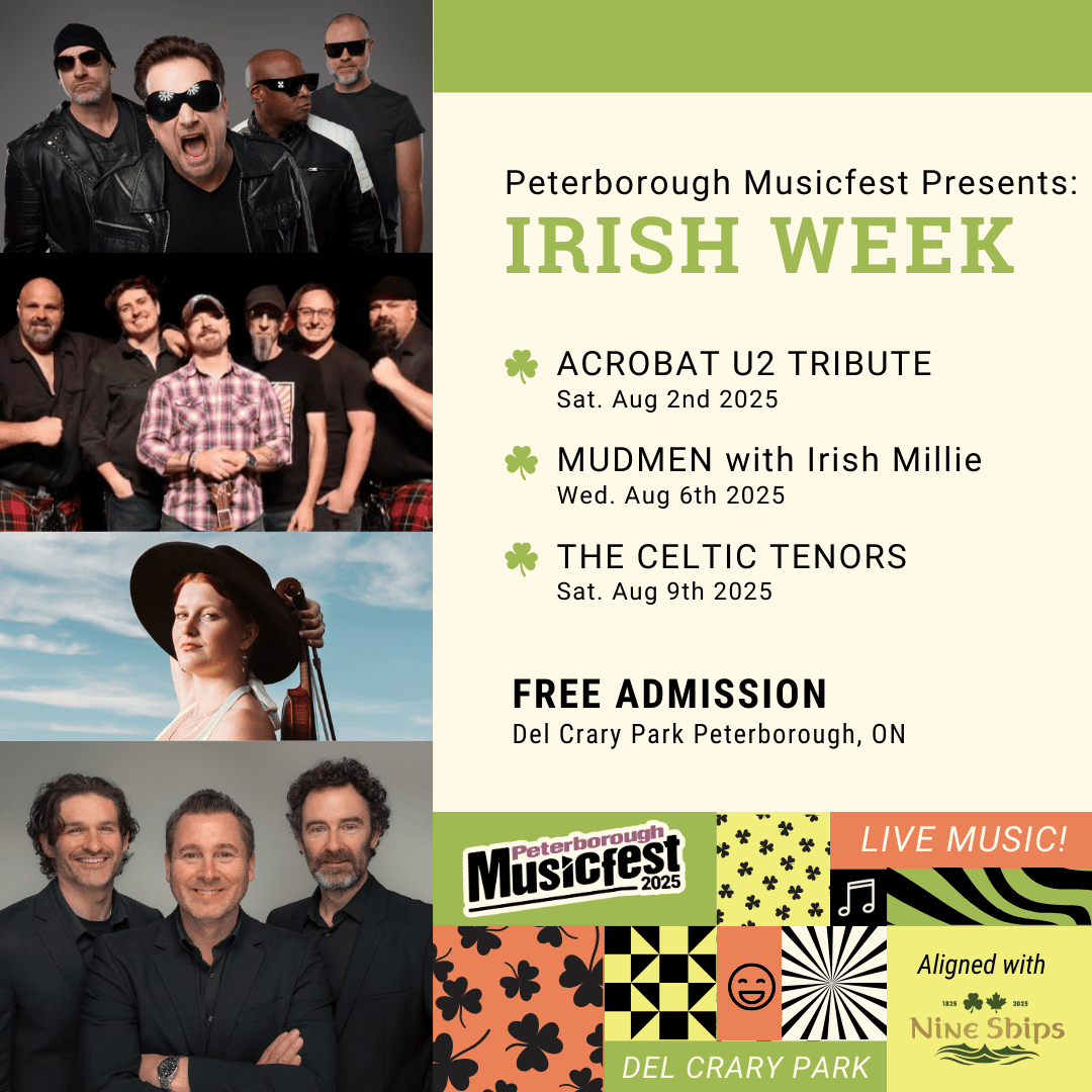 Peterborough Musicfest is proud to present a full week of Irish-themed concerts at Del Crary Park from Saturday, August 2 to Saturday, August 9, 2025, in celebration of Bicentennial 2025 and the Nine Ships 1825 commemorative event. This special series of performances honours the 200th anniversary of the arrival of the Peter Robinson settlers from Ireland, a defining moment in Peterborough’s cultural heritage.