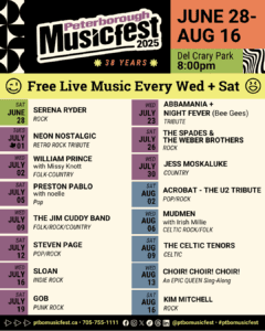 All concerts are free and open to the public. Guests are encouraged to bring lawn chairs, gather with friends, and enjoy a festive week of celebration through music in the heart of Peterborough.