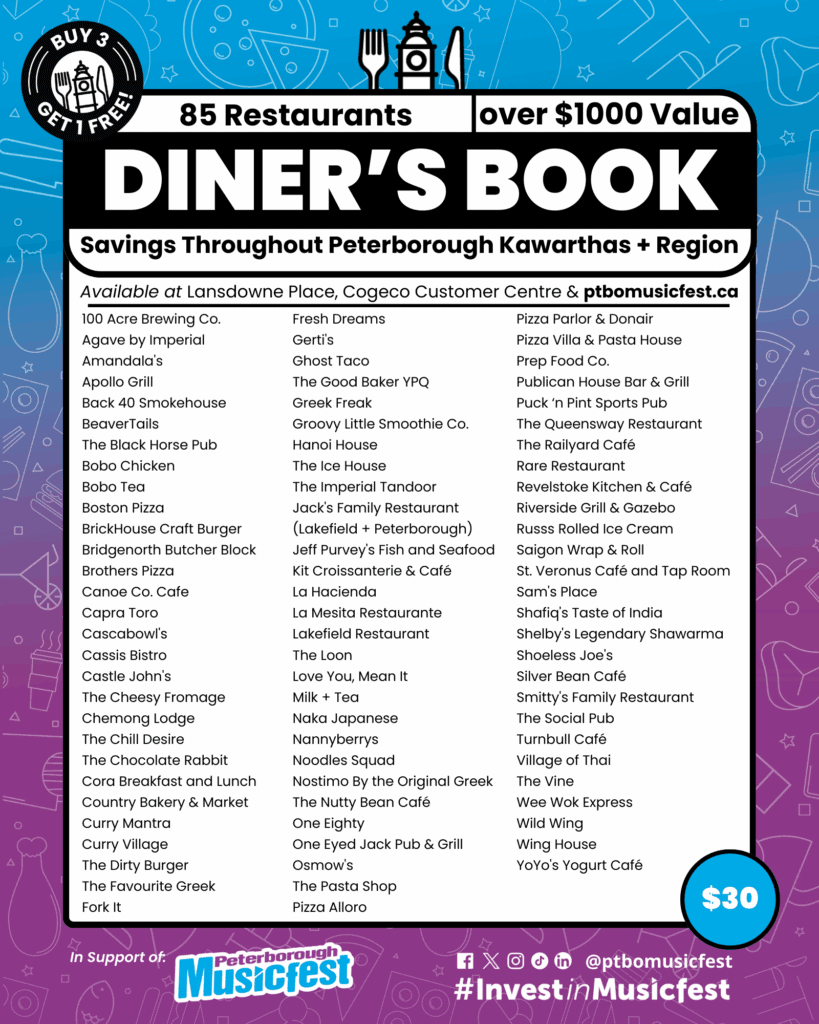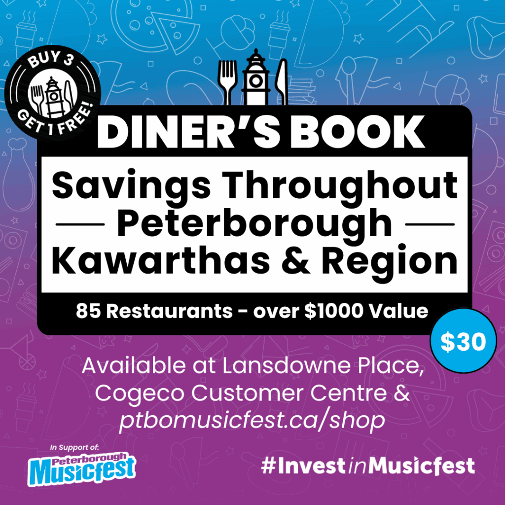āThis yearās Dinerās Book isnāt just a way to save on incredible dining experiences; itās a way to give back and help keep free admission music alive for everyone to enjoy,ā says Tracey Randall, Executive Director of Peterborough Musicfest. āItās also the perfect gift for the foodie in your life or that hard-to-buy-for person on your list. With something for every palate, itās a gift that keeps giving all year long.ā