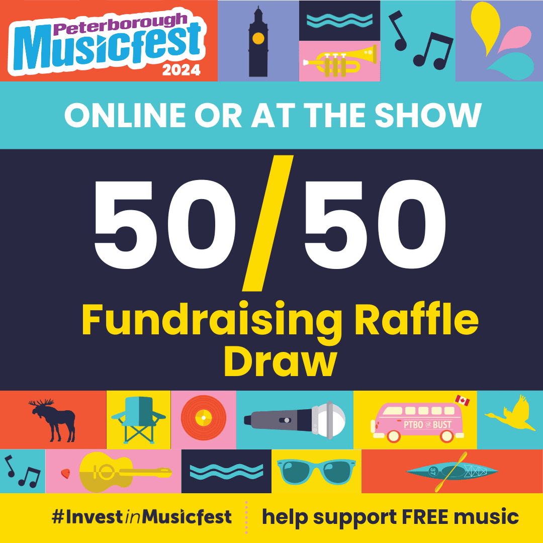 After purchasing, each patron’s random numbers will be handed to them or sent to their email, depending on how they completed their transaction. After 10pm on the night of each draw, the winning raffle number will be randomly selected and featured on the Peterborough Musicfest 50/50 Raffle page and shared on Musicfest social channels.